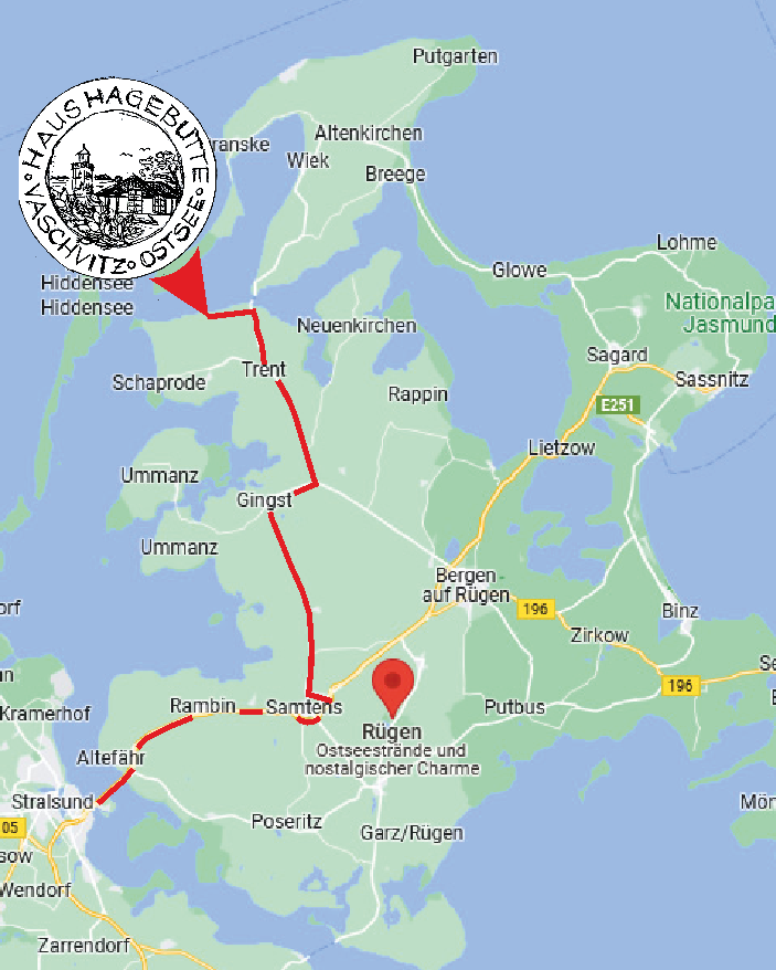 Die Insel Rügen erreichen Sie über die Rügenbrücken. Bleiben Sie auf der B96 und nehmen Sie die Abfahrt Samtens – dann weiter nach Gingst (falls Sie noch Lebensmittel benötigen, bietet sich hier ein kurzer Stopp an: EDEKA, Mühlenstraße 39 und Bioladen, Am Markt 4 – Gingst). Hinter Gingst links Richtung Trent/Wittower Fähre folgen Sie ab Trent den Hinweisschildern Aedenlife Hotel & Resort. Hier am Hotelparkplatz vorbei, dem Straßenverlauf folgend biegen Sie am kleinen Wendekreis nach links ab. Dann befindet sich das Ziel auf der linken Seite.